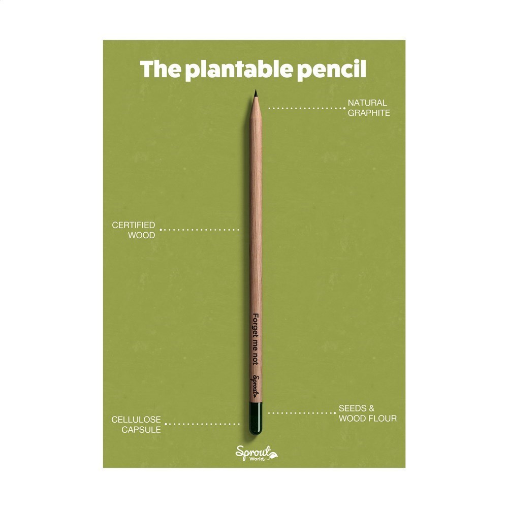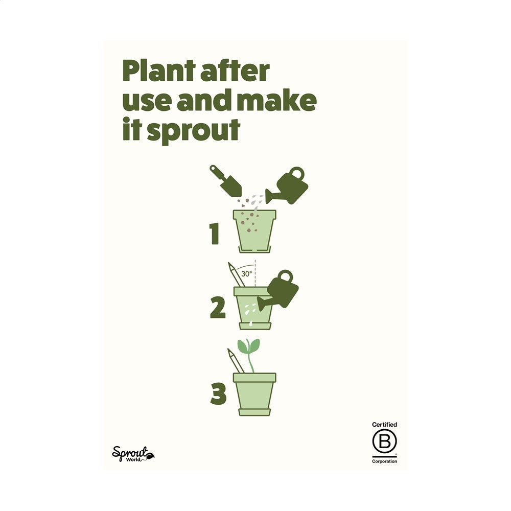 Sproutworld-Bleistift mit einer inspirierenden Botschaft für die Natur. Dieser angespitzte Bleistift ist aus Holz gefertigt. Am Ende des Bleistifts ist eine Kapsel (aus Zellulose) angebracht, die einige Samen enthält. Wenn der Stift zu klein geworden ist, um ihn zu verwenden, pflanzen Sie den Stift mit der Kapsel in die Erde. Nach etwa 2–3 Wochen keimen die Samen und entwickeln sich zu wunderschönen Blumen, duftenden Kräutern oder Gemüse. Wählen Sie aus verschiedenen Typen. Der Name der Pflanze ist standardmäßig in den Bleistift eingraviert. Der Bleistift enthält kein Blei und ist daher völlig sicher. Made in Europe. Zusatzartikel W387: Bunte Karte aus Karton zum Einlegen des Bleistifts. Die Karte enthält englischsprachige Informationen über das Produkt und verleiht dem Produkt einen exklusiven Aufmerksamkeitswert. Eine Life Cycle Assessment (LCA) dieses Produkts ist bei den Downloads verfügbar.