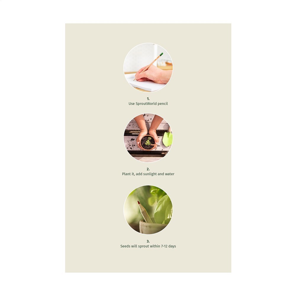 Sproutworld-Bleistift mit einer inspirierenden Botschaft für die Natur. Dieser ungespitzte Bleistift ist aus Holz gefertigt. Am Ende des Bleistifts ist eine Kapsel (aus Zellulose) angebracht, die einige Samen enthält. Wenn der Stift zu klein geworden ist, um ihn zu verwenden, pflanzen Sie den Stift mit der Kapsel in die Erde. Nach etwa 2–3 Wochen keimen die Samen und entwickeln sich zu wunderschönen Blumen, duftenden Kräutern oder Gemüse. Wählen Sie aus verschiedenen Typen. Der Name der Pflanze ist standardmäßig in den Bleistift eingraviert. Der Bleistift enthält kein Blei und ist daher völlig sicher. Made in Europe. Zusatzartikel W387: Bunte Karte aus Karton zum Einlegen des Bleistifts. Die Karte enthält englischsprachige Informationen über das Produkt und verleiht dem Produkt einen exklusiven Aufmerksamkeitswert. Eine Life Cycle Assessment (LCA) dieses Produkts ist bei den Downloads verfügbar.