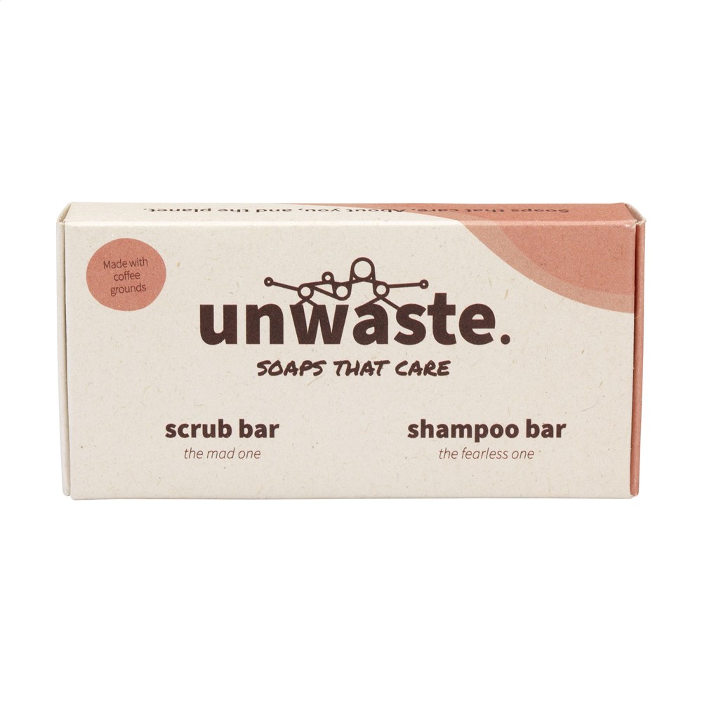 Ein Set bestehend aus einem Peeling-Riegel und einem Shampoo-Riegel in einer Verpackung. Hergestellt von der Marke Unwaste. Der Peeling-Riegel besteht aus Kaffeesatz und Kiefernöl, das Shampoo-Stück aus Kaffeeöl. Eigenschaften: ein angenehmer natürlicher Duft, die Reinigungskraft und die Farbe von Kaffee. Die Inhaltsstoffe sind natürlichen Ursprungs. Die Produkte sind vegan, tierversuchsfrei und zu 100% (mikro-)plastikfrei. Made in Holland. Verpackt pro Set in einem Karton aus 100% landwirtschaftlichen Abfällen.