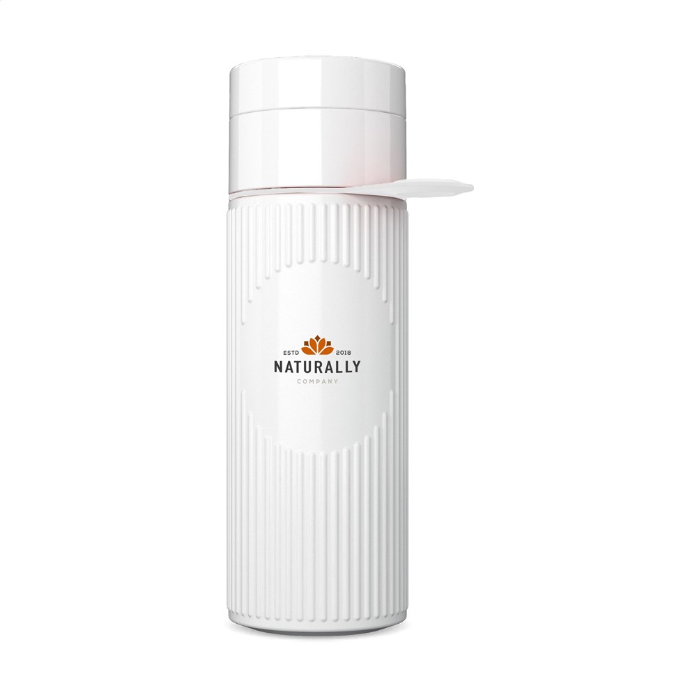 iederverwendbare Wasserflasche der Marke Join The Pipe. Diese Flasche besteht aus Bio HDPE. Ein Kunststoff, der aus dem Abfall der Zuckerrohrpflanze hergestellt wird. Das wunderschöne 3D-Rippenmuster verleiht der Flasche ein einzigartiges Erscheinungsbild. Die Flasche hat 2 Öffnungen mit Schraubverschluss: eine Trinköffnung und eine großzügige Öffnung zum einfachen Reinigen der Flasche oder zum Einfüllen von Eiswürfeln. Mit praktischer Gummi-Trageschlaufe. Auslaufsicher. Spülmaschinengeeignet bis zu 65°C. Um den Aufdruck zu erhalten, wird Waschen von Hand empfohlen. Fassungsvermögen 500 ml. Made in Holland.