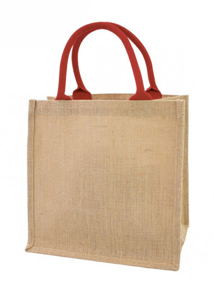 Material: 100% Jute Farbe: natur Größe: ca. 30x30 cm Boden- und Seitenfalte: ca. 20 cm Ausführung: -gewebter Baumwoll-Tragegriff (ca. 1,5x40 cm), rot Zertifikate: Oeko-Tex Standard 100, LFGB