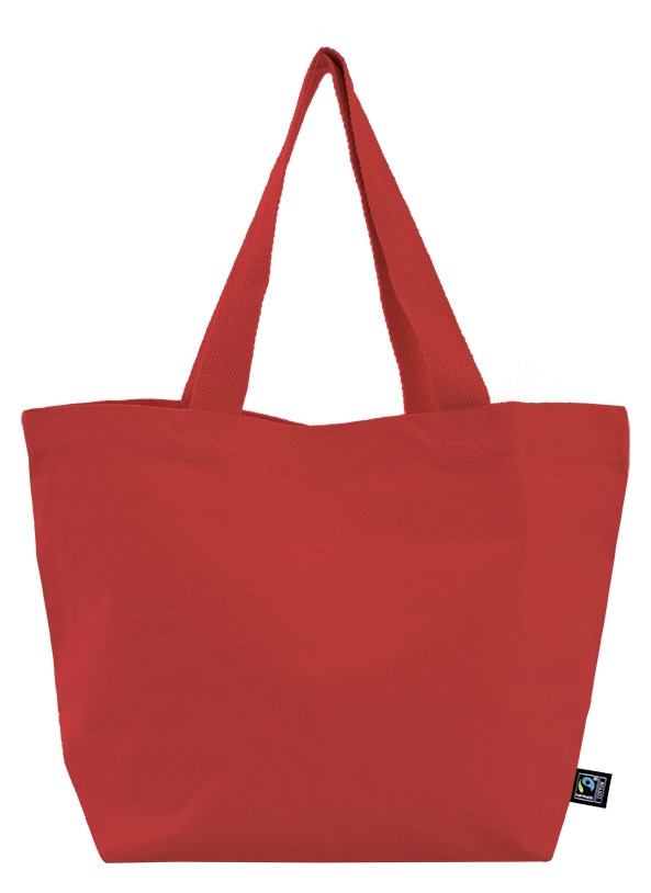Material: 100% Baumwolle Grammatur: 390g/m² Farbe: rot Größe: ca. 52x35 cm Bodenfalte: ca. 18 cm Ausführung: -gewebter flacher Baumwollhenkel (ca. 4x60 cm) Kreuznaht -Overlocknaht Zertifikate: Oeko-Tex Standard 100, Fairtrade