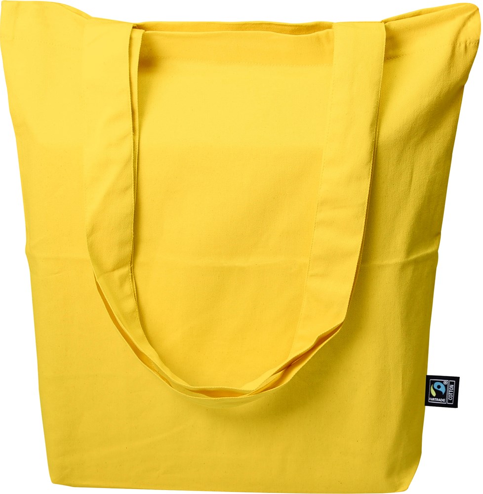 Material: 100% Baumwolle Grammatur: 200 g/m² Farbe: gelb Größe: ca. 38x42 cm Bodenfalte: ca. 7 cm Ausführung: - 2 lange Henkel (ca. 4x70 cm), Kreuznaht - Kettelnaht innen Zertifikate: Oeko-Tex Standard 100, Fairtrade