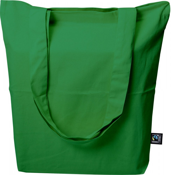 Material: 100% Baumwolle Grammatur: 200 g/m² Farbe: grün Größe: ca. 38x42 cm Bodenfalte: ca. 7 cm Ausführung: - 2 lange Henkel (ca. 4x70 cm), Kreuznaht - Kettelnaht innen Zertifikate: Oeko-Tex Standard 100, Fairtrade