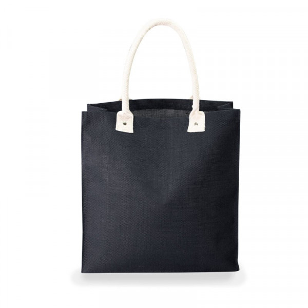 Material: 100% Jute Farbe: schwarz Größe: ca. 30x40 cm Boden- und Seitenfalte: ca. 18 cm Ausführung: 2 lange Henkel (ca. 60 cm), natur Zertifikate: Oeko-Tex Standard 100, LFGB