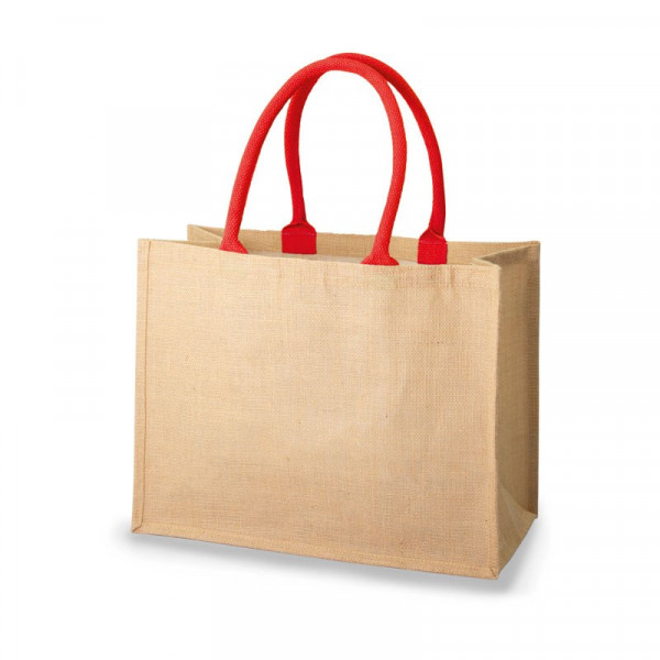 Material: 100% Jute Farbe: natur Größe: ca. 33x42 cm Boden- und Seitenfalte: ca. 19 cm Ausführung: 2 lange Henkel (ca. 60 cm), rot Zertifikate: Oeko-Tex Standard 100, LFGB