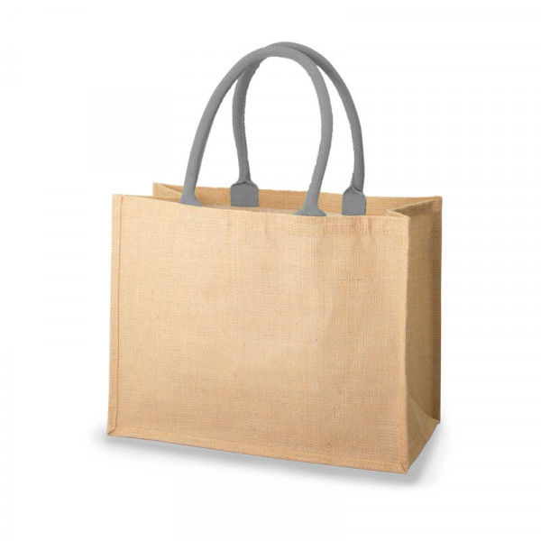 Material: 100% Jute Farbe: natur Größe: ca. 33x42 cm Boden- und Seitenfalte: ca. 19 cm Ausführung: 2 lange Henkel (ca. 60 cm), grau Zertifikate: Oeko-Tex Standard 100, LFGB