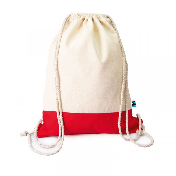 Material: 100% Baumwolle - organic Grammatur: 220 g/m² Farbe: natur mit farbig abgesetztem Boden in rot Größe: ca. 35x45 cm Ausführung: - Kordelzug natur mit Schlaufen - Kettelnaht innen Zertifikate: Oeko-Tex Standard 100, Fairtrade, organic