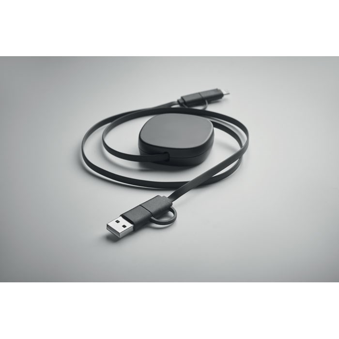 Einziehbares Ladekabel 60W. Gehäuse aus recyceltem ABS. Eingang: 2in1 Typ-C und Typ-A. Ausgang: Typ-C und Mikro-B (2 in 1 Pin). Kabellänge: 80 cm.