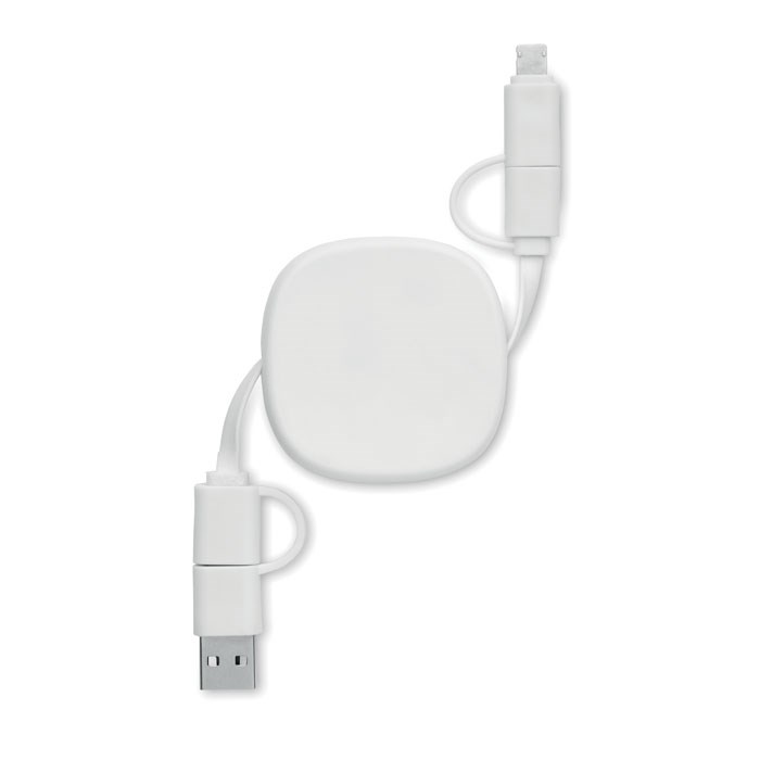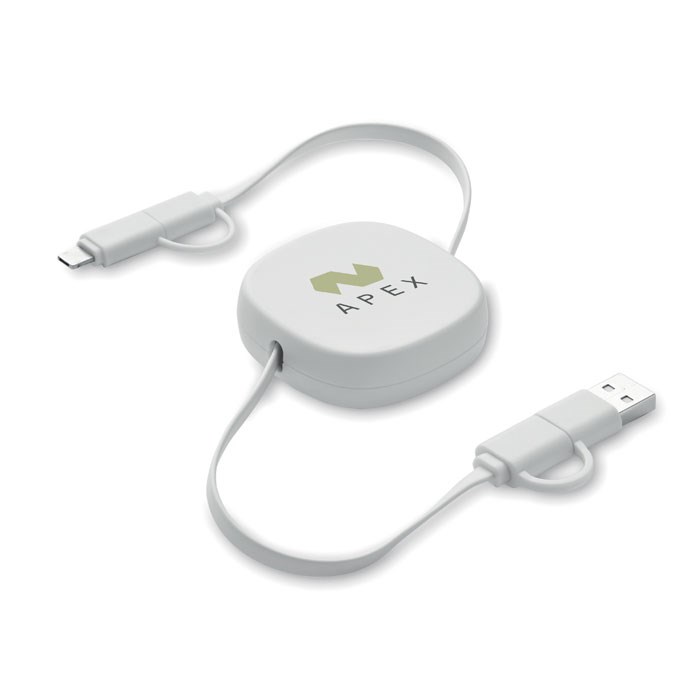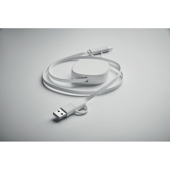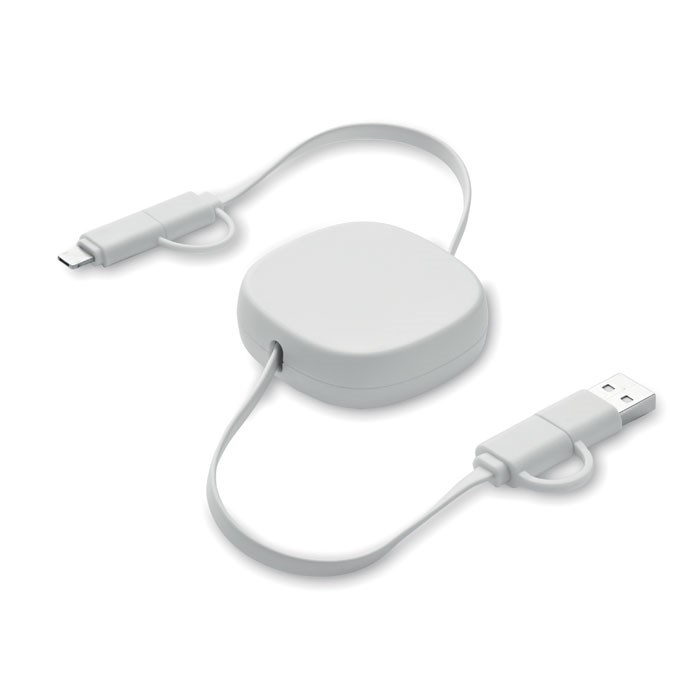 Einziehbares Ladekabel 60W. Gehäuse aus recyceltem ABS. Eingang: 2in1 Typ-C und Typ-A. Ausgang: Typ-C und Mikro-B (2 in 1 Pin). Kabellänge: 80 cm.