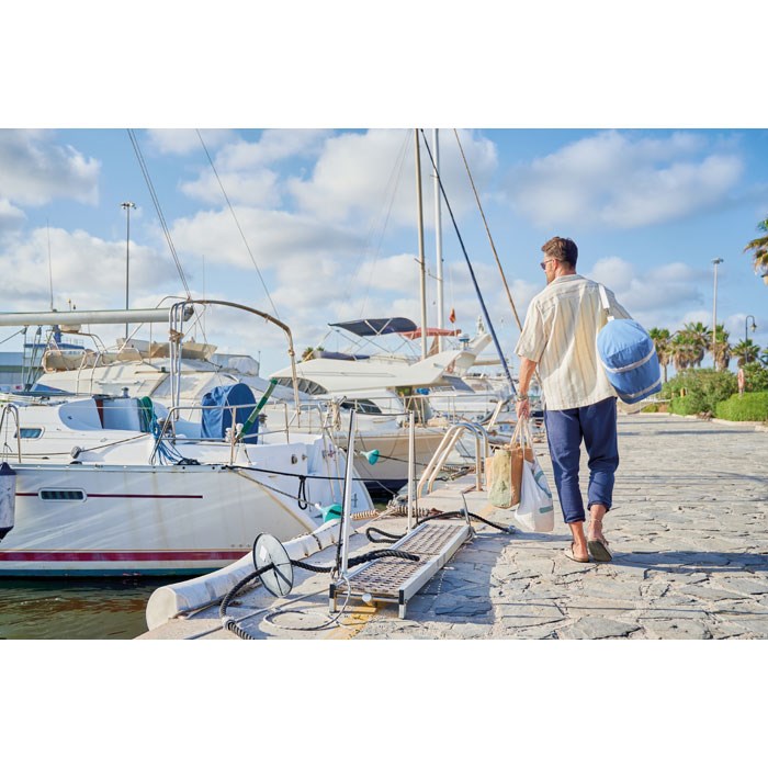 Große Tasche aus recycelten Materialien (60% recycelte Baumwolle, 40% recycelter Polyester) in 320 g/m². Tragegriffe aus natürlichem Baumwollgewebe. Verstellbarer und abnehmbarer Schultergurt.