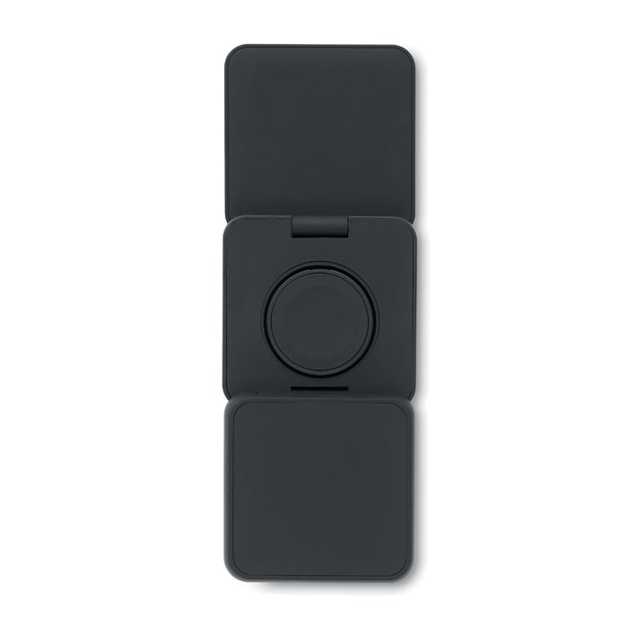3in1 faltbare Ladestation. Gummiertes, recyceltes ABS. Inkl. kabelloses Ladegerät 15 W, Smartwatch-Ladegerät (nur Apple®) sowie TWS-Ladegerät.
