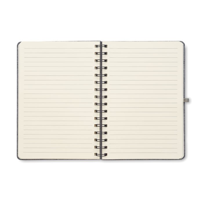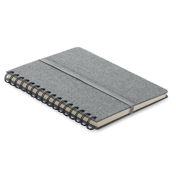 DIN A5 Notizbuch mit Hard Cover aus 600D RPET. Inkl. Smartphone-Halter. Spiralbindung. 80 Blatt (160 Seiten) liniertes Recyclingpapier 70g/m². Elastisches Verschlussband.