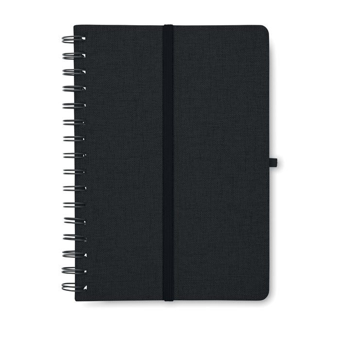 DIN A5 Notizbuch mit Hard Cover aus 600D RPET. Inkl. Smartphone-Halter. Spiralbindung. 80 Blatt (160 Seiten) liniertes Recyclingpapier 70g/m². Elastisches Verschlussband.