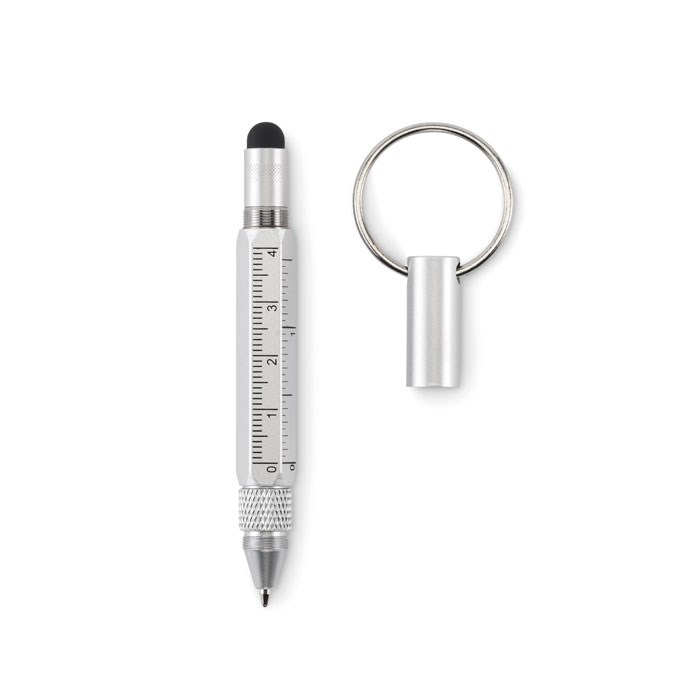 Schlüsselring mit Drehkugelschreiber aus recyceltem Aluminium, Stylus, Lineal 4 cm/1,5 Zoll und 2in1 Phillips- und Flachkopfschraubendreher. Schwarze Tinte.