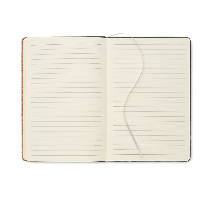 DIN A5 Notizbuch mit Cover aus RPET-Filz und Kork. 80 Blatt (160 Seiten) liniertes Recyclingpapier. Elastisches Verschlussband, Lesebändchen und Stiftschlaufe. FSC MIX 100% | P7.1 | FSC-C213206