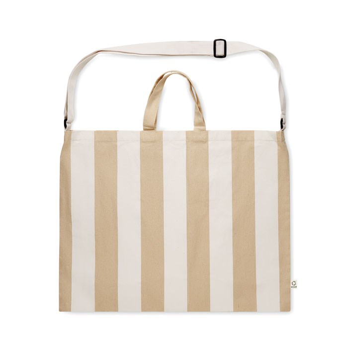 Extra große gestreifte Strandtasche aus 280 g/m² (recycelte Baumwolle 80% und recycelter Polyester 20%). Innentasche, kurze Tragegriffe und großer verstellbarer Schultergurt.