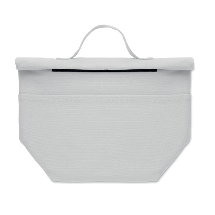 Kühltasche aus aus recyceltem Polycotton (70% recycelte Baumwolle, 30% recycelter Polyester) mit Rolltop-Klettverschluss. Isolierung: 3mm PE- Schaum mit 12C PEVA.