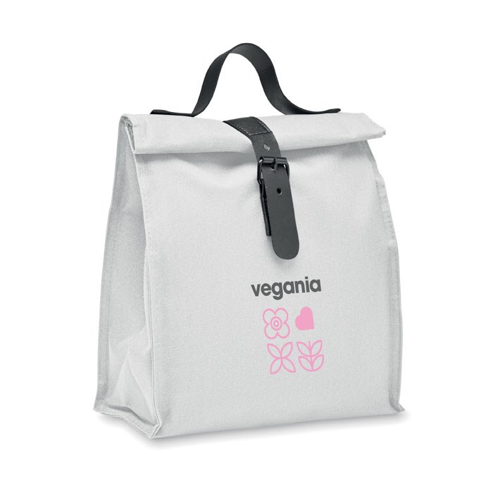 Lunch-Kühltasche aus 600D RPET-Polyester mit Rolltop. Tragegriff und Verschluss aus PU. Isolierung: 3mm PE-Schaum mit PEVA.