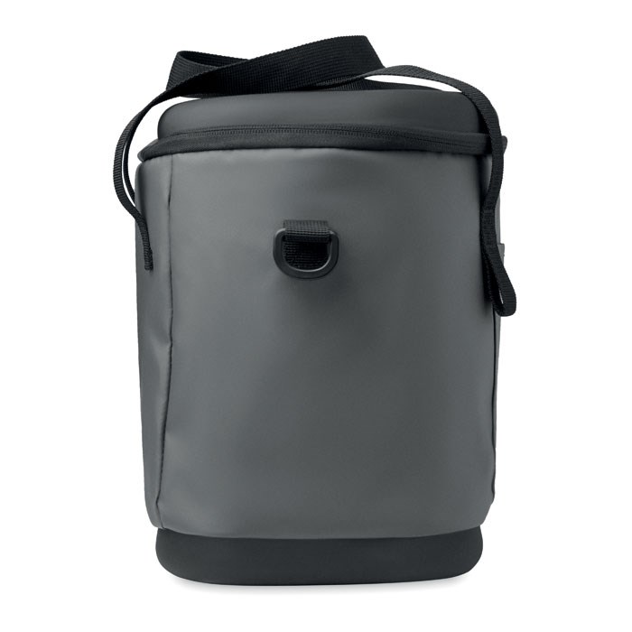Kühltasche aus 50C-Plane. Ober- und Unterseite aus festem PEVA. Front- und Innentasche aus Mesh. Isoliermaterial: PE-Schaumstoffschicht. Inkl. 2 Griffe und verstellbarer, abnehmbarer Gurt. Seitlicher Kapselheber. Füllmenge: 16L.