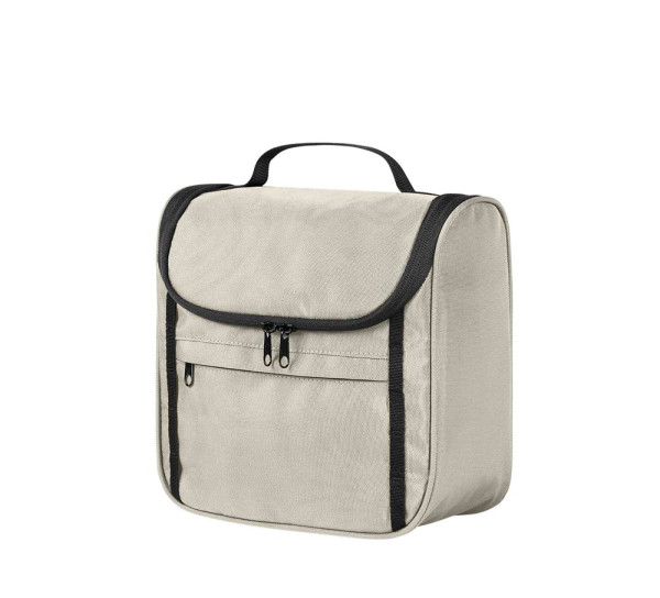 attraktive Kulturtasche zum Hängen oder Stellen; recycelter Oberstoff; Reißverschlussvortasche; Schlaufenband auf der Front; dreiseitig umlaufender 2-Wege-Reißverschluss; Reißverschluss-Fach im Deckel; vier Netz-Einsteckfächer innen; Handgriff