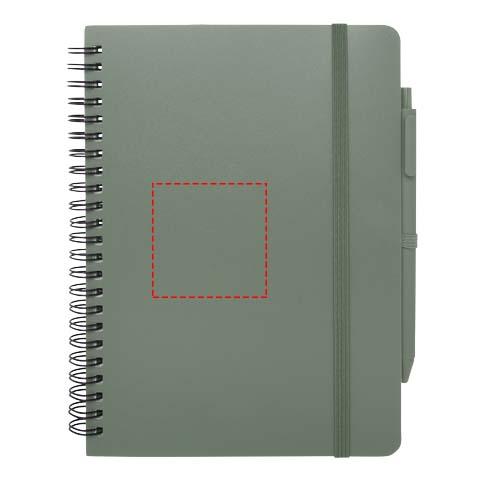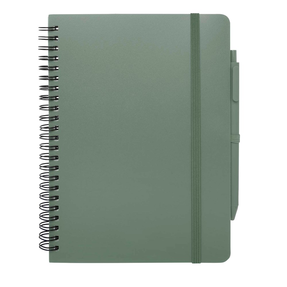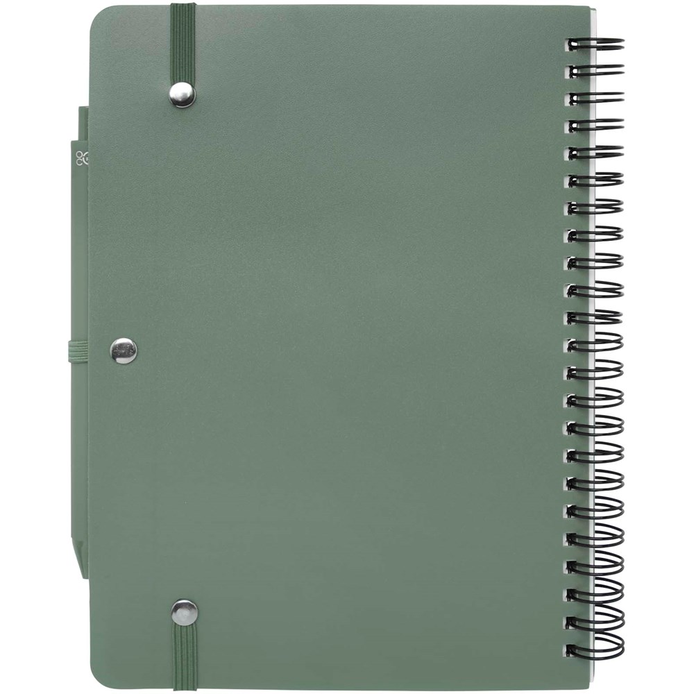 Das Thalaasa A5 Hardcover Notizbuch besteht aus recyceltem ozeangebundenem Kunststoff und umfasst 80 Blatt, liniert, aus cremefarbenem 70 g/m² Papier. Das Notizbuch hat abgerundete Ecken. Es ist mit einem elastischen Verschluss und einer Stiftschlaufe ausgestattet. Der Kugelschreiber mit schwarzer Tinte ist ebenfalls aus recyceltem, ozeangebundenem Kunststoff hergestellt. Schreiblänge: 1000 Meter. Schreibspitze: 1 mm.