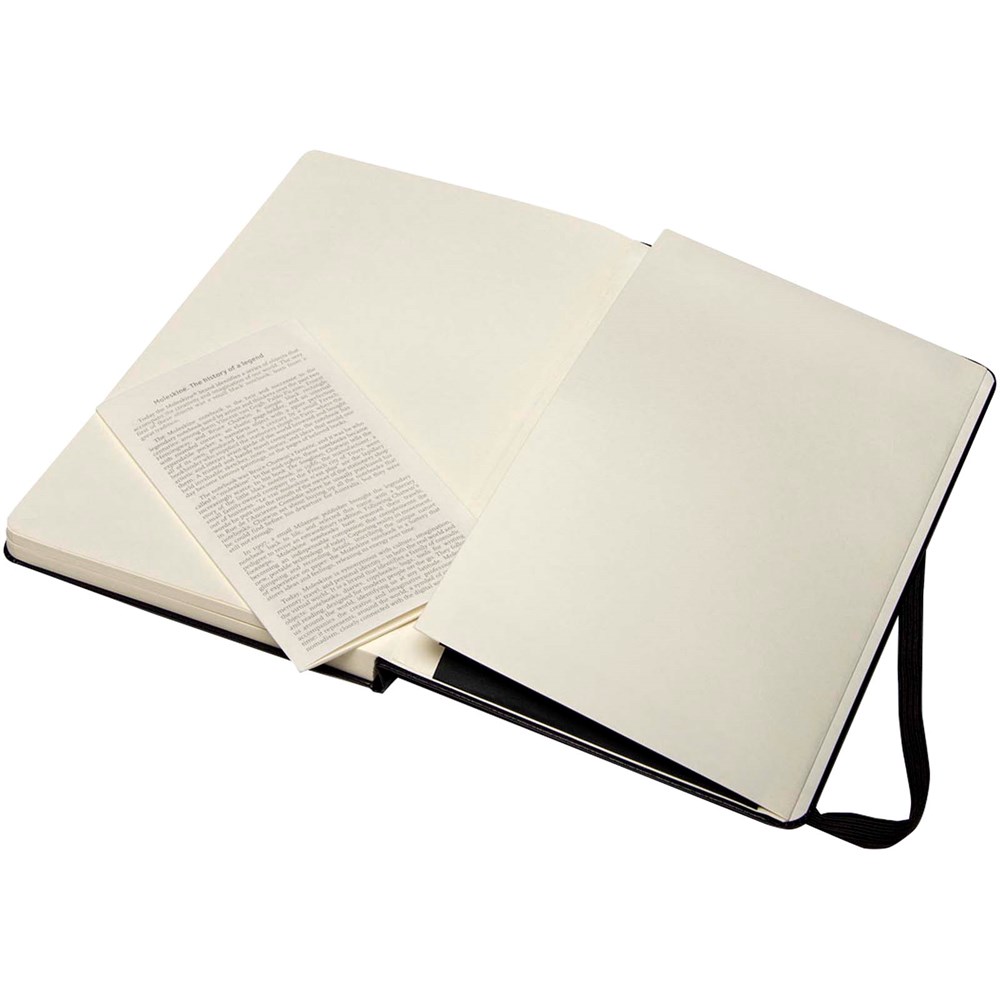 Das Large Moleskine Skizzenbuch ist in Karton gebunden, hat einen abgerundeten Einband und besteht aus hochwertigem, säurefreiem Papier. Das Skizzenbuch ist mit einem Lesezeichen, einem elastischen Verschluss und einer ausziehbaren Innentasche ausgestattet, die die Geschichte von Moleskine festhält.