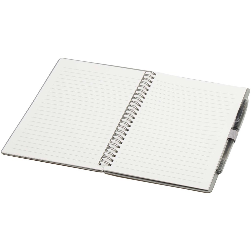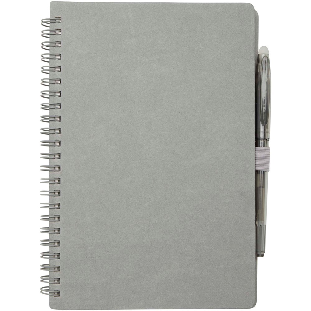 Wiederverwendbares A5 Hardcover Notizbuch und Stiftset aus Steinpapier. Das Notizbuch hat einen Einband aus Karton, abgerundete Ecken und besteht aus 32 linierten Seiten aus 120 g/m² Papier. Steinpapier ist 100 % holzfrei und der Produktionsprozess verbraucht weniger Energie als recyceltes oder neues Zellstoffpapier. Auf der Rückseite befindet sich eine Tasche für ein schwarzes Reinigungstuch (im Lieferumfang enthalten). Der radierbare Stift besteht aus recyceltem Kunststoff mit transparentem Schaft, weißem Radiergummi auf der Oberseite und einfarbigem Griff. Tintenfarbe: Schwarz. Schreiblänge: 250 Meter. Schreibspitze: 0,7 mm.
