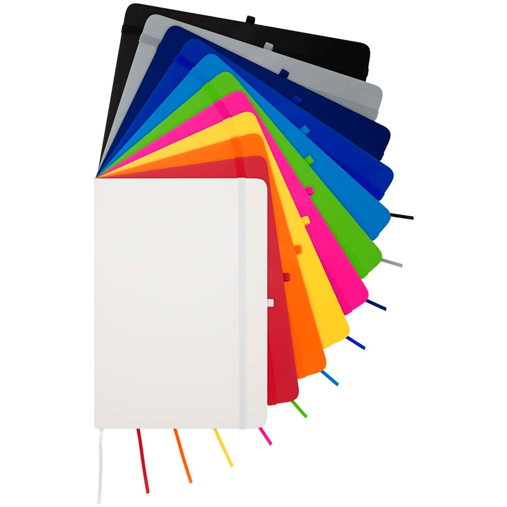 Das Spectrum Plus A5 Hardcover Notizbuch mit abgerundeten Ecken ist nicht nur ein unentbehrlicher Begleiter im Büro, sondern auch ein hervorragender Weg, um für Ihre Marke zu werben. Das Notizbuch aus Karton mit weichem Einband und 80 linierten, cremefarbenen Seiten (70 g/m²) eignet sich ideal für schnelle Ideen oder längere Notizen. Das Notizbuch ist mit Stiftschlaufe, elastischem Verschluss, Lesebändchen und erweiterbarrter Tasche ausgestattet.
