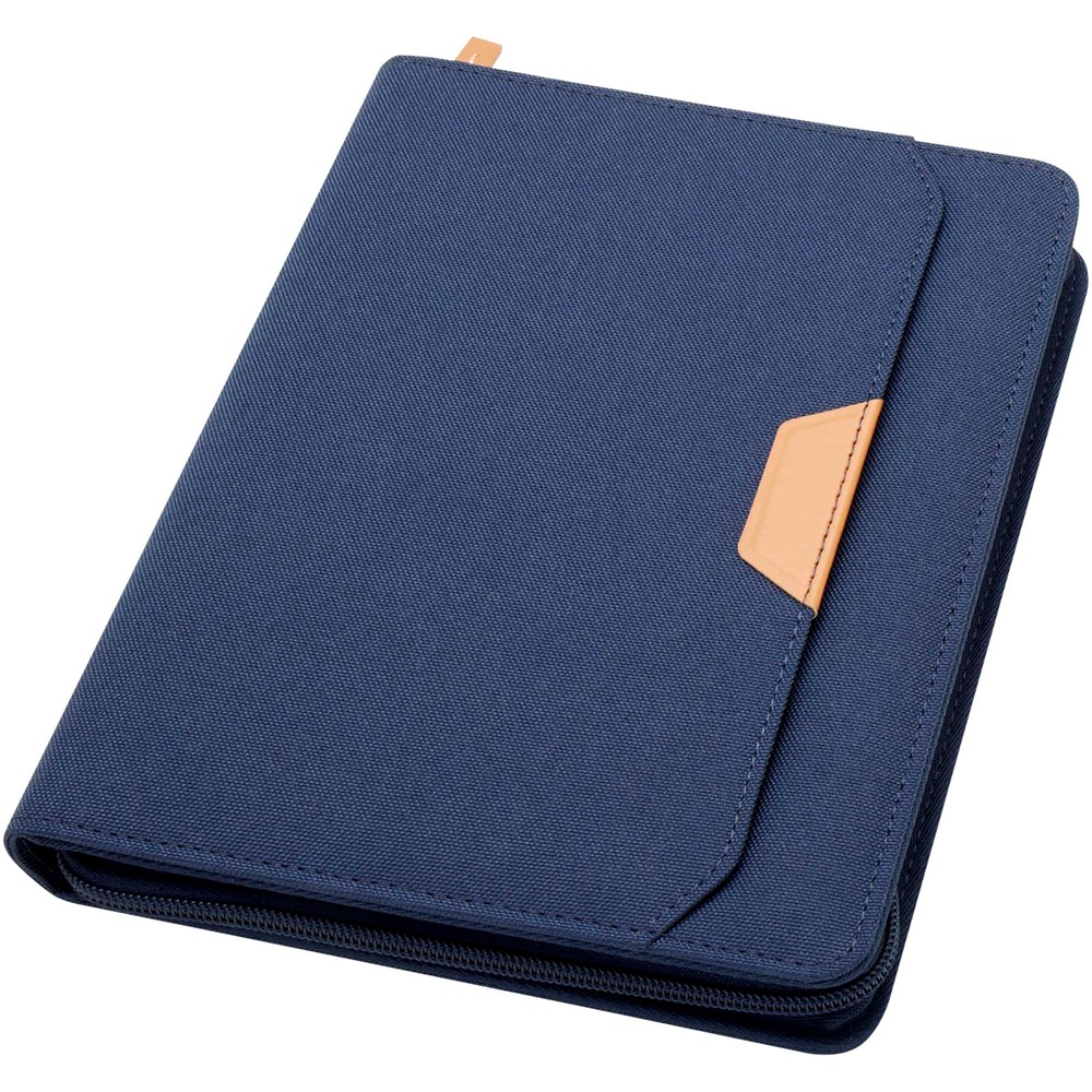 Die Nomumi A5 Mappe mit abgerundeten Ecken ist ein praktisches Büroutensil aus recyceltem Kunststoff. Die Mappe umfasst 64 cremefarbene 80 g/m2 linierte Seiten, einen Reißverschluss, eine Stiftschlaufe und eine erweiterbare Tasche.