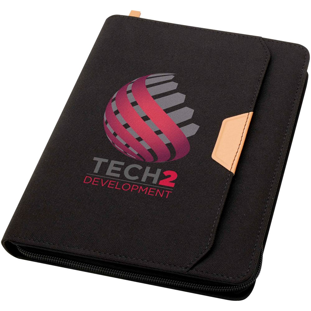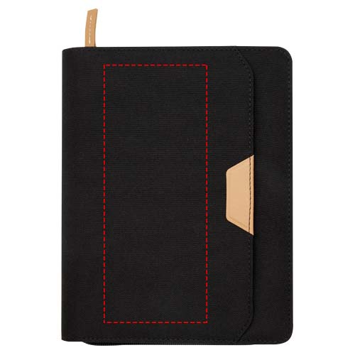 Die Nomumi A5 Mappe mit abgerundeten Ecken ist ein praktisches Büroutensil aus recyceltem Kunststoff. Die Mappe umfasst 64 cremefarbene 80 g/m2 linierte Seiten, einen Reißverschluss, eine Stiftschlaufe und eine erweiterbare Tasche.