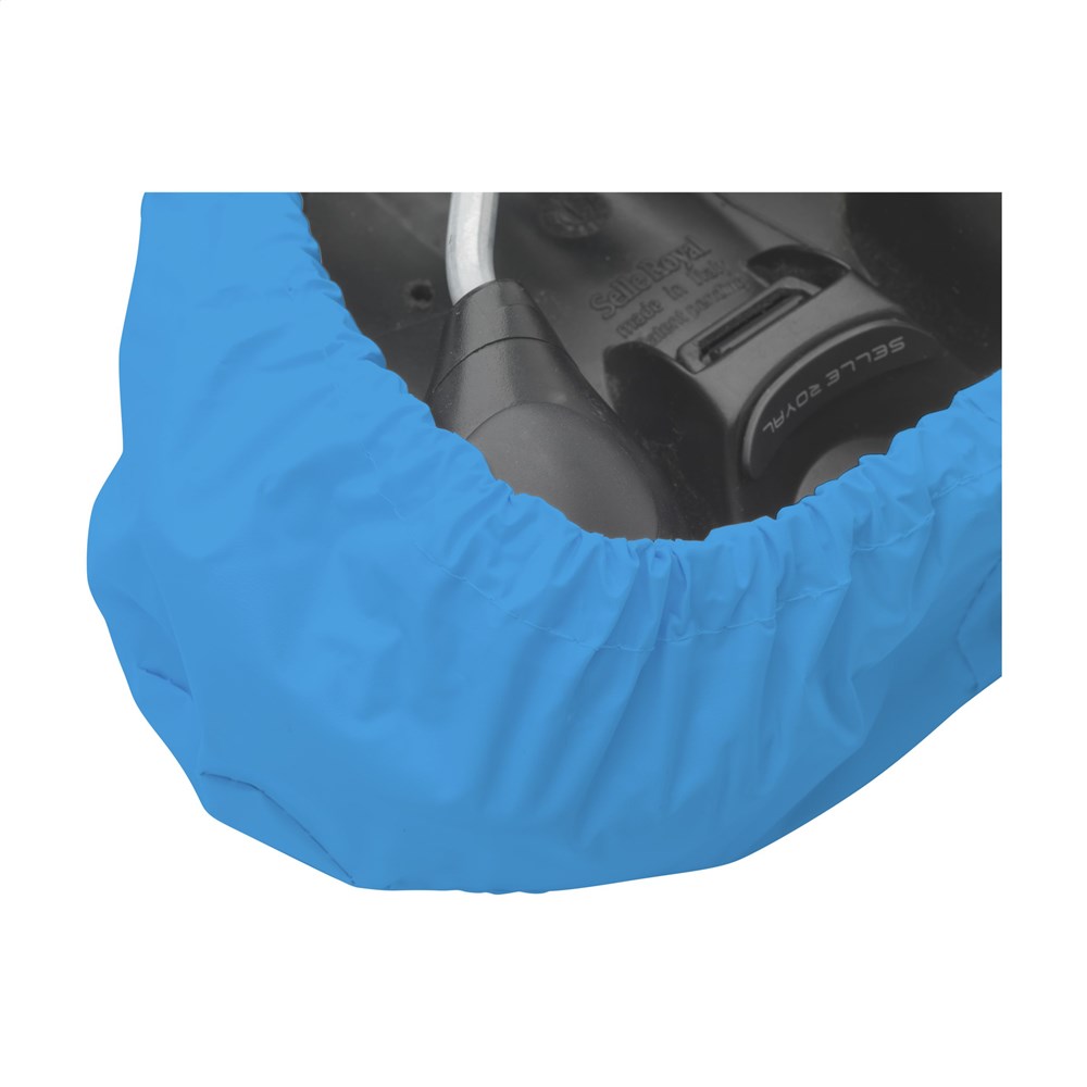 Sattelüberzug aus recyceltem PVC (60% recyceltes PVC und 40% reines PVC). Jeder Sattelüberzug ist innen mit einer Pappfolie versehen, damit er nicht knittert. Das Gummiband unten ist bei diesem Modell nicht sichtbar, es ist sauber verarbeitet. Der Bezug schützt den Sattel vor Schmutz und Feuchtigkeit (nicht 100% wasserdicht).