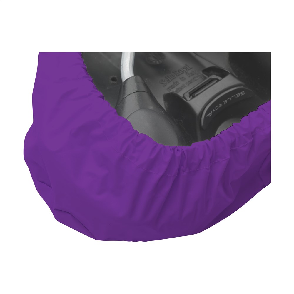 Sattelüberzug aus recyceltem PVC (60% recyceltes PVC und 40% reines PVC). Jeder Sattelüberzug ist innen mit einer Pappfolie versehen, damit er nicht knittert. Das Gummiband unten ist bei diesem Modell nicht sichtbar, es ist sauber verarbeitet. Der Bezug schützt den Sattel vor Schmutz und Feuchtigkeit (nicht 100% wasserdicht).
