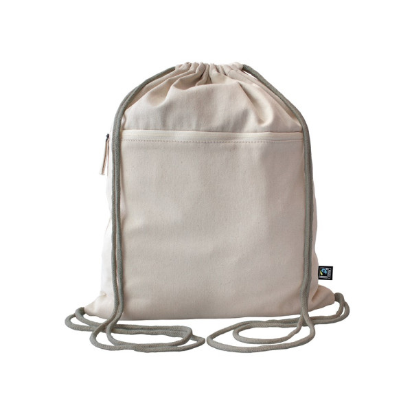 Material Rucksack/Kordeln: 100% Baumwolle Grammatur: ca. 200 g/m² Eigengewicht: ca. 185 g Rucksack/Reißverschluss: natur Größe: ca. 46 x 38 cm Reißverschluss: ca. 38 cm Länge Ausführung: - Kettelnaht innen - Kordelfarbe: stone Zertifikate: Oeko-Tex Standard 100, Fairtrade