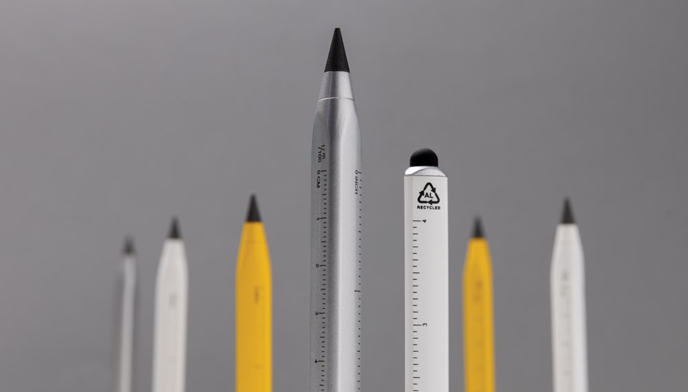 Schicker Infinity-Stift aus RCS-zertifiziert recyceltem Aluminium. Recycelter Anteil insgesamt: 40%, bezogen auf das Gesamtgewicht des Artikels. Die RCS-Zertifizierung gewährleistet eine vollständig zertifizierte Lieferkette für die recycelten Materialien. Der dreieckige Körper zeigt auf einer Seite die Zentimeter an und auf der anderen Seite die Inches. Herkömmliche Holzbleistifte schreiben nur bis zu 200 Meter, aber dieser baumfreie Unendlichkeitsbleistift hat eine Schreiblänge von bis zu 20.000 Metern und verwendet eine Graphitspitze, um eine Graphitlinie zu erzeugen. Er schreibt nicht nur wie ein Bleistift, sondern die Markierungen können auch wieder gelöscht werden. Er hinterlässt eine Graphitlinie auf dem Papier wie ein herkömmlicher Holzbleistift, nutzt sich aber so langsam ab, dass er bis zu 100 herkömmliche Holzbleistifte überdauern sollte! Mit Touch-Tip zur Bedienung des mobilen Geräts. Verpackt in FSC®-Mix-Verpackung.