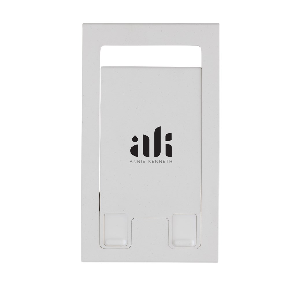 Flacher und faltbarer Telefonständer aus RSC recyceltem ABS. Der Ständer wird flach und gefaltet geliefert und kann zu einem Telefonständer aufgeklappt werden, der für Telefone aller Größen geeignet ist. Der Ständer ist stark genug, um den Betrachtungswinkel einzustellen. Die Silikonpolsterung sorgt dafür, dass Ihr Telefon stabil gehalten wird. Gesamter recycelter Inhalt: 85%, bezogen auf das Gesamtgewicht des Artikels. Die RCS-Zertifizierung gewährleistet eine vollständig zertifizierte Lieferkette der recycelten Materialien. Verpackt in FSC®-Verpackung. PVC-frei.