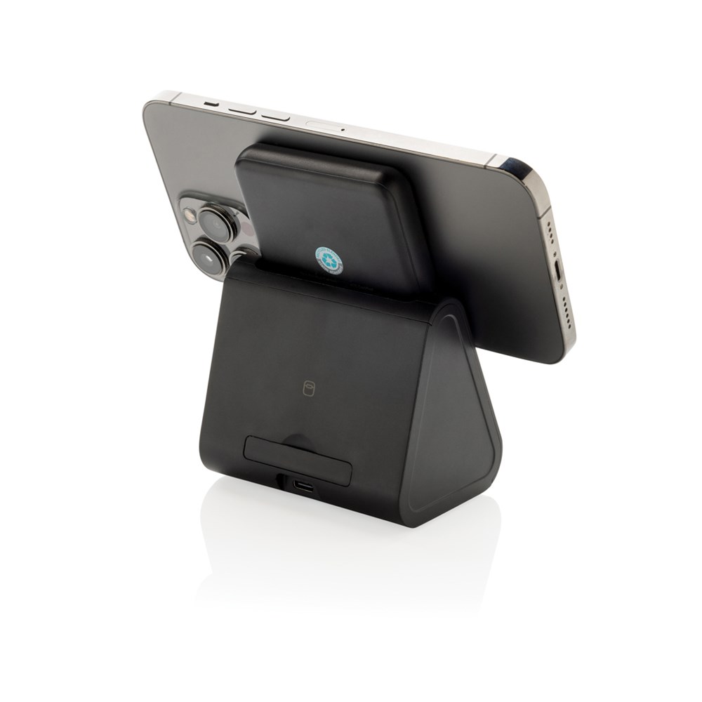 3-in-1 kabelloses Ladegerät mit Powerbank-Dock, hergestellt aus RCS ABS & RCS recyceltem PC. Wenn Sie zu Hause oder bei der Arbeit sind, verwenden Sie den Ständer, wenn Sie irgendwo hingehen müssen, nehmen Sie einfach die magnetische Powerbank aus dem Dock und klicken Sie sie an Ihr Telefon. Gesamter recycelter Inhalt: 59%, bezogen auf das Gesamtgewicht des Artikels. Die RCS-Zertifizierung gewährleistet eine vollständig zertifizierte Lieferkette der recycelten Materialien. Das kabellose Ladegerät ist mit einem magnetischen kabellosen 5W-Ladegerät und einem zusätzlichen kabellosen 5W-Ladegerät ausgestattet, das für Ohrhörer oder andere kleine kabellos aufladbare Geräte geeignet ist, sowie einem kabellosen 2,5W-Ladegerät für Smartwatches (nur Apple-Uhren). Inklusive RCS-zertifiziertem 120cm langem Kabel aus recyceltem TPE. Verpackt in FSC®-Mix-Verpackung. Artikel und Zubehör 100% PVC-frei. Input: 5V/2,4A für optimale Nutzung. Output: Telefon5V/1A, Kopfhörer: 5V/1A, Uhr: 5V/0,5A.PVC frei