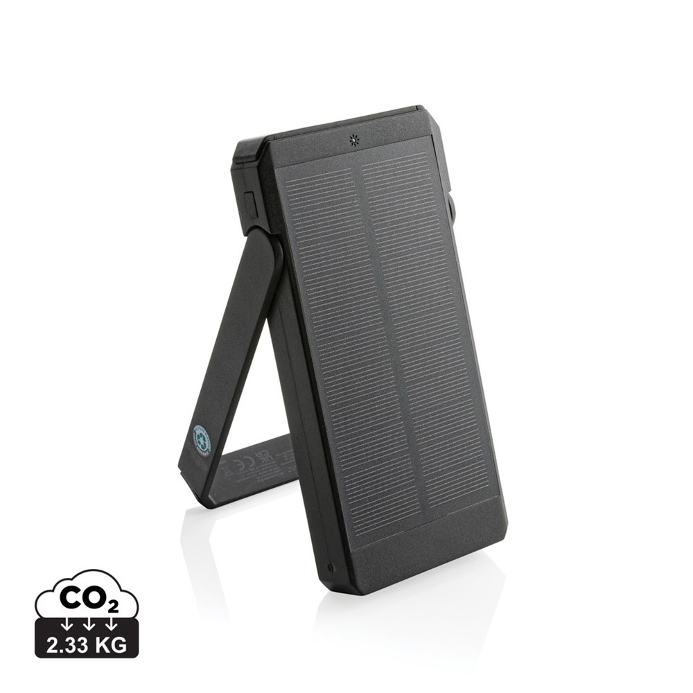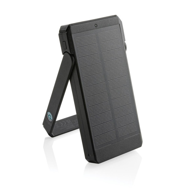 10.000 mAh Solar-Powerbank aus RCS-zertifiziert recyceltem ABS. Gesamter recycelter Inhalt: 18% bezogen auf das Gesamtgewicht des Artikels. Die RCS-Zertifizierung gewährleistet eine vollständig zertifizierte Lieferkette für die recycelten Materialien. Die Powerbank verwendet hochwertige monokristalline Solarzellen mit einer Umwandlungsrate von 19%. Die Ladegeschwindigkeit hängt von den Umgebungsbedingungen ab. Mit integrierter Standfunktion zur Nutzung der Solarzellen in einem optimalen Winkel. Die Powerbank enthält eine langlebige A-Grade Lithium-Batterie mit 10.000 mAh. Aufladegeschwindigkeit Solar: 5V/200mA. Input Type-C: 5V/2A. Output: USB A: 5V/2A; Type-C: 5V/2A. Artikel und Zubehör PVC-frei. Inklusive RCS-zertifizierte recyceltem TPE-Ladekabel. Verpackt in FSC®-Mix-Verpackung. Registered Design®.