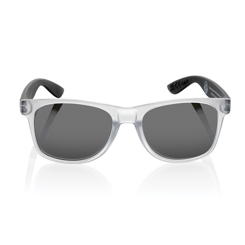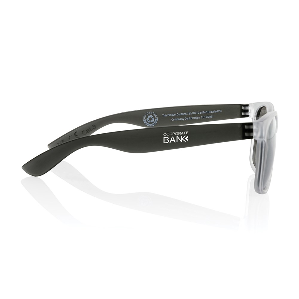 Sonnenbrille mit farbig verspiegelten Gläsern und mit transparentem RCS-zertifiziert recycelten PC-Gestell. Gesamter recycelter Inhalt: 72% bezogen auf das Gesamtgewicht des Artikels. Die RCS-Zertifizierung gewährleistet eine vollständig zertifizierte Lieferkette für die recycelten Materialien. Die Gläser entsprechen EN ISO 12312-1, sind UV 400 und CAT 3. Verpackt in einer FSC®-Kraftbox.