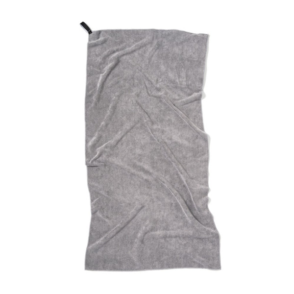 Sporthandtuch aus Mikrofaser 300gr/m² , hergestellt aus recycelten PET-Flaschen. Durch das einzigartige Frotteegefühl nimmt dieses Handtuch mehr Wasser auf und trocknet dreimal schneller als ein herkömmliches Handtuch. Ideal für Outdoor-Aktivitäten und Sport. Das Handtuch ist leicht und kompakt und hat die ideale Größe für Reisen oder das Fitnessstudio. Besteht zu 50% aus GRS-zertifizierten (Global Recycle Standard) recycelten Materialien, wobei die GRS-Zertifizierung eine vollständig zertifizierte Lieferkette für recycelte Materialien garantiert. Der gesamte recycelte Anteil basiert auf dem Gesamtgewicht des Produkts.