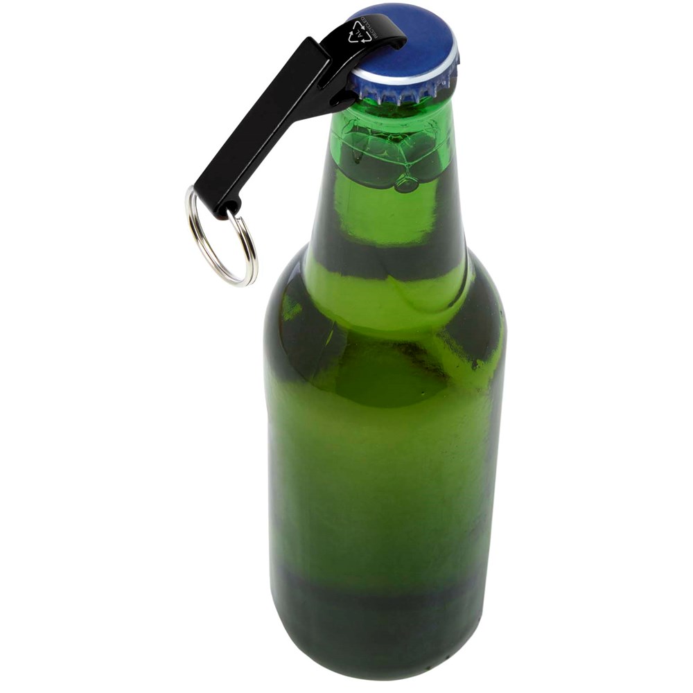 Der starke und leichte Tao-Flaschen- und Dosenöffner mit Schlüsselanhänger besteht zu 83% aus RCS-zertifiziertem, recyceltem Aluminium. Der Recycled Claim Standard (RCS) prüft den Recyclinganteil eines Produkts über die gesamte Lieferkette hinweg. Erhältlich in einer Vielzahl von auffälligen Farben mit Metallic-Finish, die ein aufgedrucktes Logo besonders gut zur Geltung bringen.