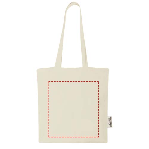 Die Tragetasche Madras aus 100 % GRS-zertifizierter recycelter Baumwolle ist die perfekte Tasche zum Verschenken bei Veranstaltungen, Konferenzen oder als Einkaufstasche für kleine Einkäufe. Die Baumwolldichte von 140 g/m² Baumwolle macht die Tasche robust, langlebig und geeignet, um schwere Gegenstände zu transportieren. Mit einer Tragegriffhöhe von 30cm (Tragegrifflänge 60cm) lässt sich diese Tasche gut tragen. Die für diese Tragetasche verfügbaren Druckverfahren sind ebenfalls GRS-zertifiziert, so dass die gesamte Lieferkette transparent und zertifiziert ist. Hergestellt in Indien. Beständigkeit bis zu 5kg.