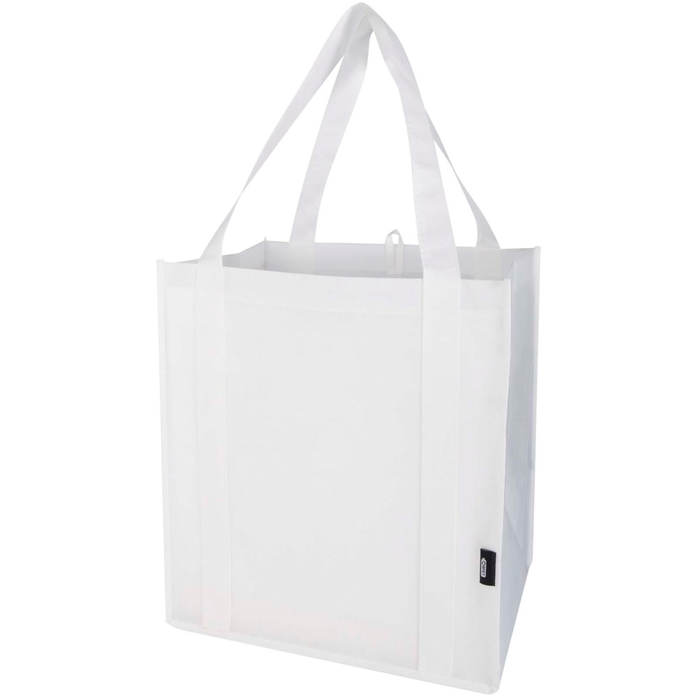 Die Liberty Tragetasche aus GRS-zertifiziertem Recyclingmaterial besteht aus strapazierfähigem und reißfestem RPET-Non Woven und verfügt über einen harten Boden, der sie vielseitig und stabil macht. Die Tasche hat ein großes Hauptfach und 25 cm lange Tragegriffe. Fassungsvermögen: 29 Liter. Beständigkeit bis zu 12 kg.
