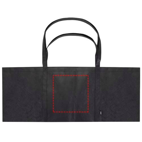 Die Jumbo Tragetasche aus GRS-zertifiziertem Recyclingmaterial besteht aus strapazierfähigem und reißfestem RPET-Non Woven und bietet mit bis zu 65 Litern ein extra großes Fassungsvermögen für vielfältige Aktivitäten wie den Großeinkauf oder einen Tag am Strand oder im Park. Mit verstärkten kurzen (24 cm) und langen (37 cm) Griffen für maximalen Tragekomfort. Bei Nichtgebrauch lässt sie sich leicht zusammenfalten und verstauen. Beständigkeit bis zu 15 kg.