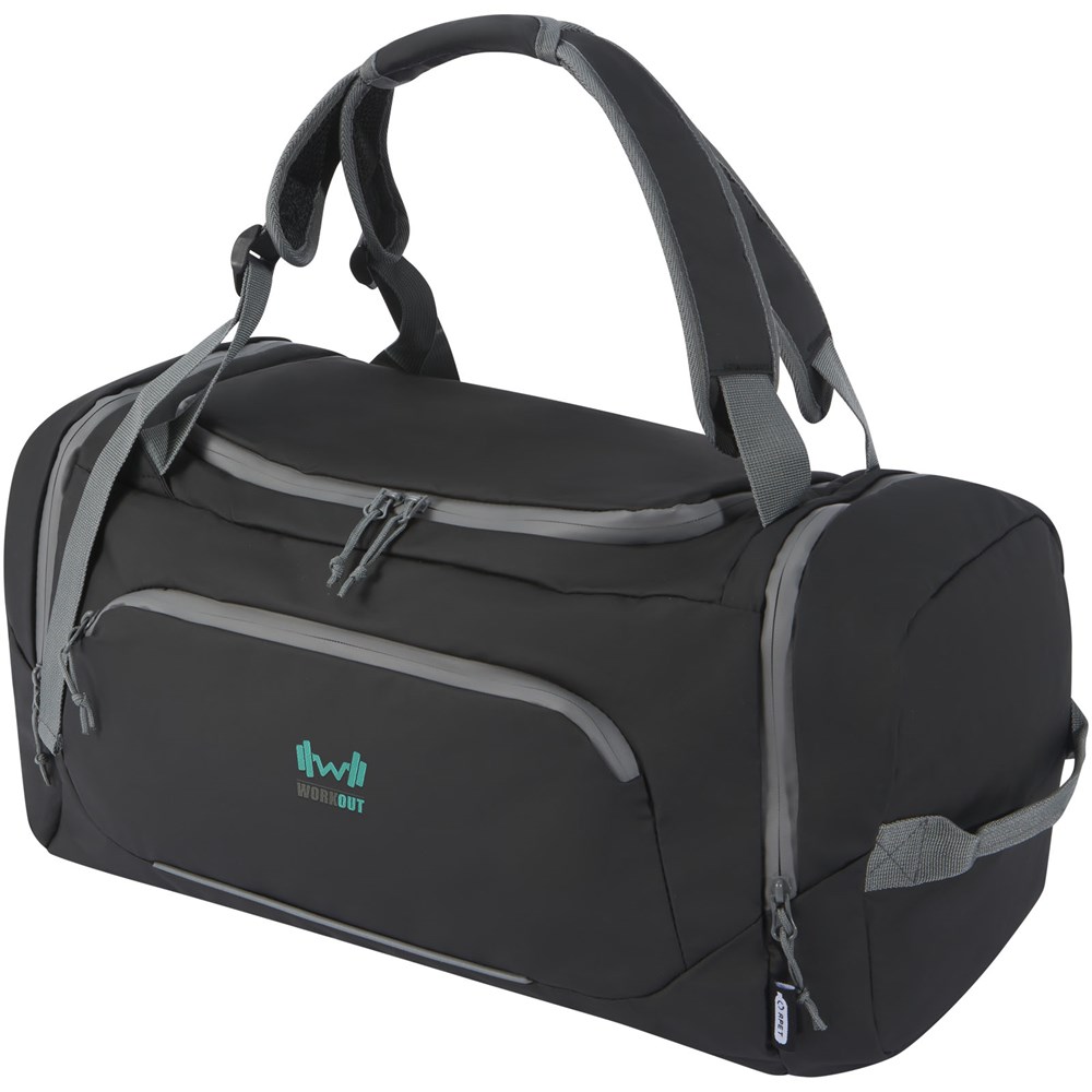 Wasserabweisende 2-in-1 Reisetasche aus GRS-zertifizierten, recycelten Materialien, einschließlich der Reißverschlüsse. Sie verfügt über ein geräumiges Hauptfach mit U-förmiger Öffnung für einfachen Zugriff, zwei seitliche Reißverschlusstaschen (eine davon für Schuhe), eine Reißverschlusstasche auf der Vorderseite, eine Netztasche für die Wasserflasche auf der Rückseite und reflektierende Paspeln für bessere Sichtbarkeit. Die Tasche kann auf 3 verschiedene Arten getragen werden: In der Hand, über der Schulter oder als Rucksack mit gepolsterten und verstellbaren Schulterriemen. Der Hauptstoff, das Futter, die Gurte und die Reißverschlüsse bestehen aus recyceltem GRS-Material. Kapazität: 35 Liter. PVC frei.