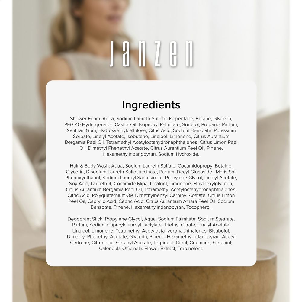 Ein Geschenkpaket der Marke JANZEN, speziell für Männer zusammengestellt, mit 3 Pflegeprodukten für eine angenehme Haut- und Haarpflege. Inhalt: • Duschschaum – 200 ml • Haar- und Körperwaschmittel – 200 g • Deodorant-Stick – 75 ml. Dieses Geschenkset mit hochwertigen Pflegeprodukten sorgt für einen frischen und selbstbewussten Start in den Tag. Mit dem herrlichen Duft von Bergamotte und Zedernholz, ergänzt durch Noten von Zitrusfrüchten, Muskatnuss und Moschus. Die Produkte sind in einer luxuriösen Geschenkbox verpackt.