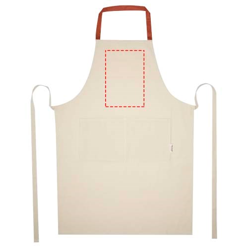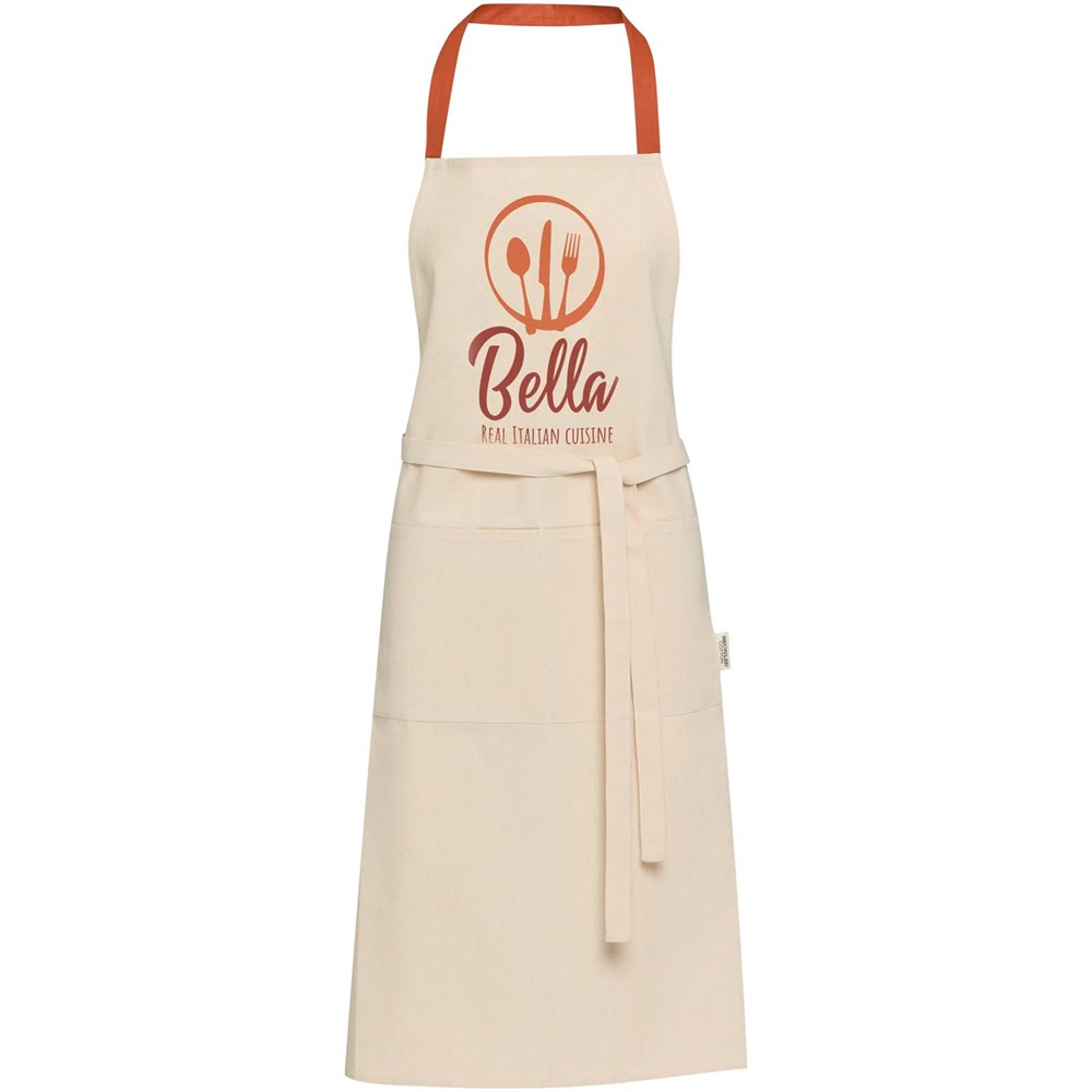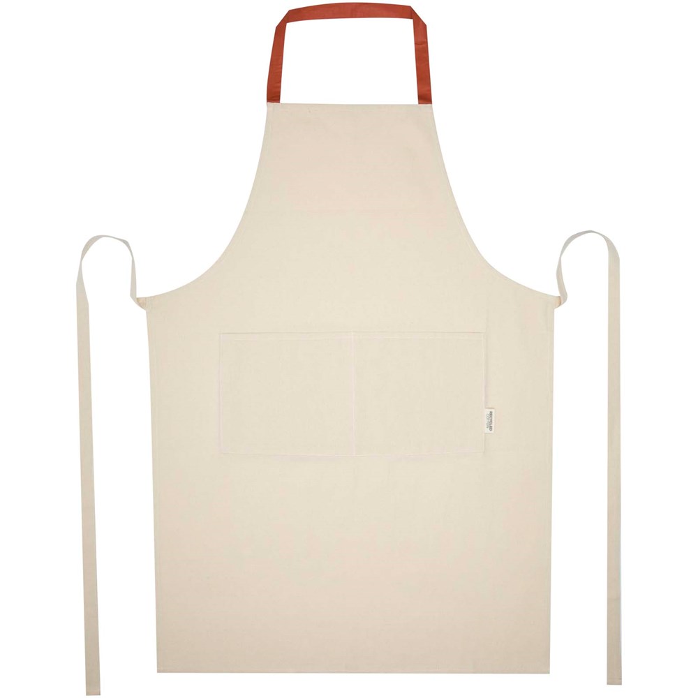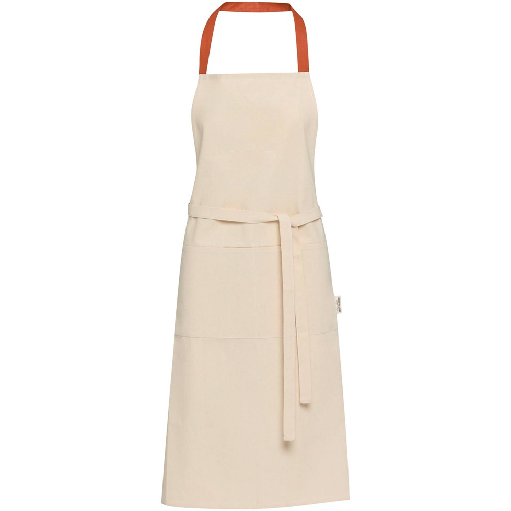 Die Nia Schürze ist aus 100 % GRS-zertifizierter Recyclingbaumwolle mit einem Gewicht von 200 g/m² gefertigt. Mit ihrer natürlichen Baumwollfarbe und dem kontrastfarbigen Kragenband schützt diese Schürze Ihre Kleidung beim Kochen. Die zwei nebeneinander liegenden Taschen mit einer Gesamtgröße von 45 × 20 cm und die 1 Meter langen Schürzenbänder machen die Nia Schürze zu einem praktischen und stilvollen Küchenhelfer.