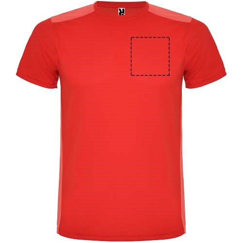 Funktions-T-Shirt aus atmungsaktivem Stoff. Rundhalsausschnitt. Kombination aus zwei Polyestergeweben im Rücken- und Schulterbereich. Polyester Bienenwabe Vorne und 3D-Netz Polyester auf Schulter und Rücken. Material ist feuchtigkeitabsorbierend. Ziernähte auf den Schultern und Seiten. Schnitt mit verlängertem Rückenteil. Abnehmbares Etikett.
