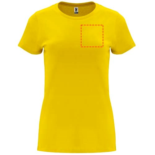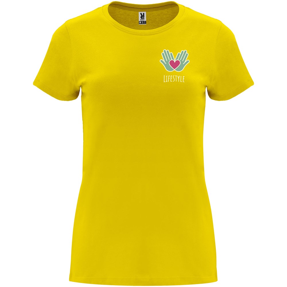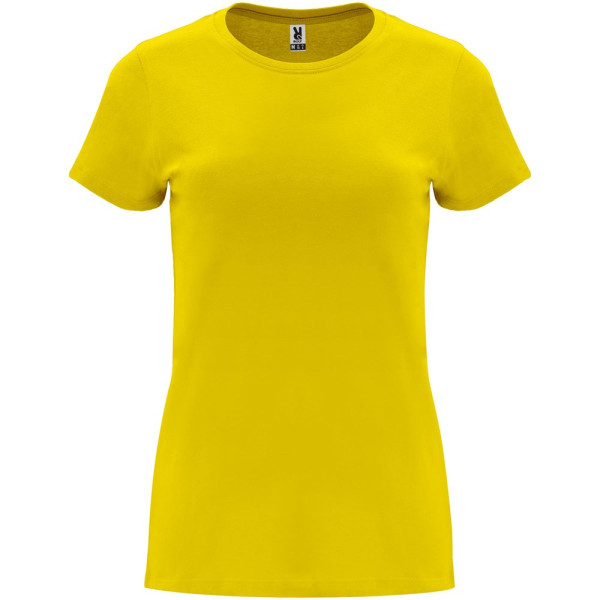 Tailliertes kurzärmeliges T-Shirt für Damen. Rundhalsausschnitt mit 1×1 Rippstrick. Verstärkte und verdeckte Nähte am Kragen. Herausnehmbares Etikett.