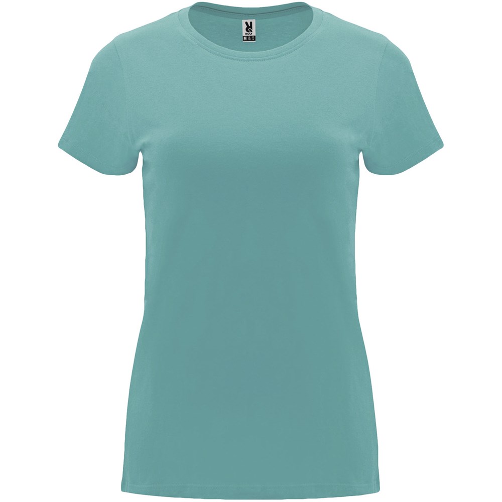 Tailliertes kurzärmeliges T-Shirt für Damen. Rundhalsausschnitt mit 1×1 Rippstrick. Verstärkte und verdeckte Nähte am Kragen. Herausnehmbares Etikett.
